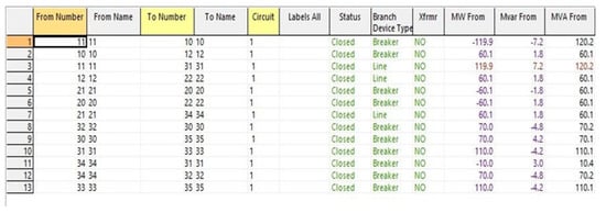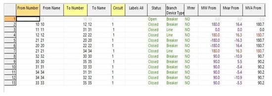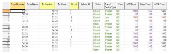 Figure 11 shows the values of each transmission line after one circuit breaker is attacked in the 12-bus system. Moreover, it can be found that the value of “Mvar loss” has increased on the transmission lines from 12 to 22 and from 21 to 34. The power loss in transmission is much greater than the attack of two circuit breakers. Therefore, to achieve the same power efficiency, the power system must consume more resources. This will also lead to greater energy waste and resource waste and cause greater economic losses to the power system.