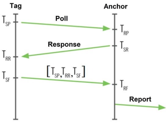 where c is the speed of light, TSP, TSR, and TSF are the times of sending the polls and the packet responses by the anchor and the tag; and TRP, TRR, and TRF are the times of receiving the polls and the packet responses by the anchor and the tag [12,27].