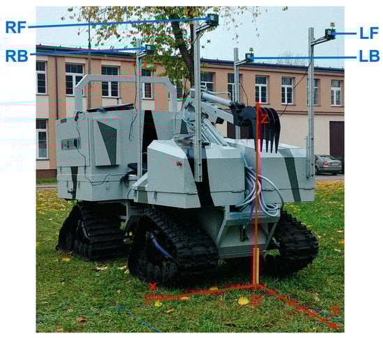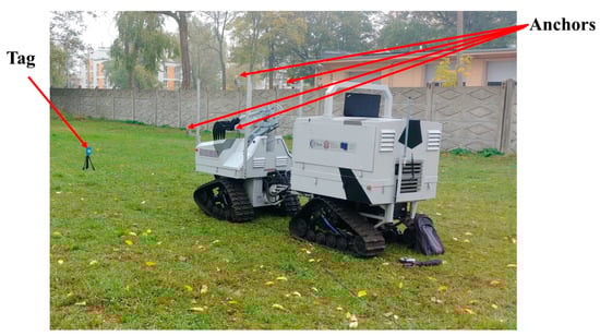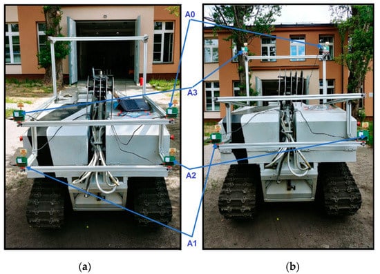 The “Dromader” UGV (Figure 3a,b) was created at the Military University of Technology in Warsaw as part of the ICAR project (European Defence Agency). The anchors of the location system were placed on the UGV in the following configuration shown in Figure 3a,b. The present article is an extension of the research carried out in [12].