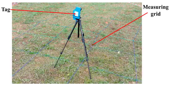 In order to conduct field tests, a special test site has been built in the Military University of Technology that spans 20 × 20 m2. The selected UGV has been positioned on one of the edges of the site (Figure 4), and a special checkered net has been spun on it. The net consists of nodes 1 m apart from each other (Figure 5). The spatial configuration of 4 anchors has been deployed on the UGV (Figure 4), whereas the tag has been mounted on a tripod with the ability to be moved between nodes.