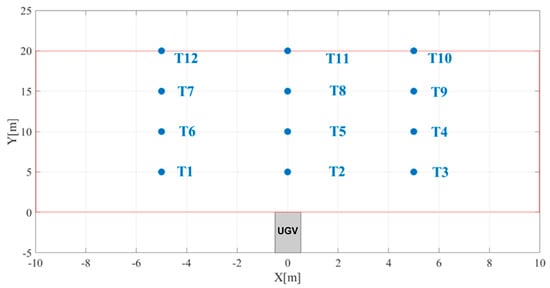 In order to assess the effectiveness of the spatial configuration, a series of data packets was registered. Each packet was set to last 30 s, during which data from four anchors (LF-left front, RF-right front, LB-left back, RB-right back) were recorded. The anchors were distributed as shown in Figure 6. Their vertical placement height was subjected to change during testing. A mobile tag was positioned in one of twelve test positions (T1–T12) shown in Figure 7, and its position’s height has also been subjected to change during testing. These changes represent the possibility for the guide to change elevation in relation to the UGV, similarly to when he would traverse an obstacle or a ditch. Additionally, the UGV was stationary during testing.