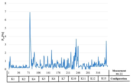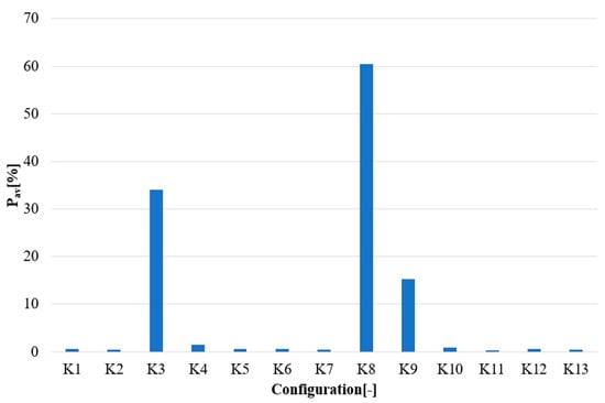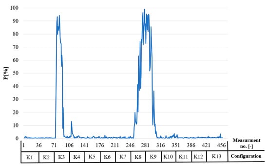 Registered data was later used in order to determine the data availability in the areas in front of the UGV. To do this, a percentage of lost data packets was calculated. These lost packets are symptoms of communication interference and breakdown. Since different UGVs may be used in follow-me scenarios, as mentioned before, the anchor’s vertical positions were changed during testing (configurations K1–K13, Table 1). Additionally, each of the previously mentioned anchor positions has been tested, for each of the three tag position heights (H1–H3, Table 2). As it has been stated before, this parameter also influences the overall hardware system configuration for a follow-me scenario.