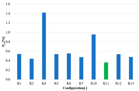 The average values of the number of data packets lost show that configurations no. 3, 8, and 9 (Figure 9) do not meet the set up requirement of 10% possible data packets lost, thus rendering them unusable for further testing and analysis. Removing these configurations allows for a more precise data analysis. Figure 10 and Figure 11 show the same data types as Figure 8 and Figure 9, but without said configurations.
