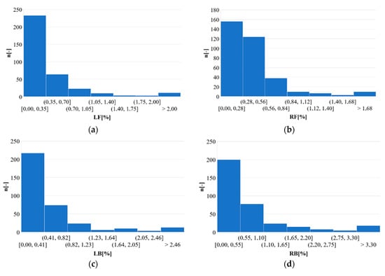Figure 12. Histogram values of: (a) LF, (b) RF, (c) LB, (d) RB.
