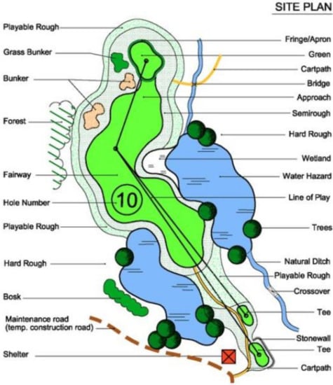 Golf course components (adopted from [25]). Reproduced with permission from Deutsche Golf Holding Ltd. Detail Overview Golf and Landscape Elements; Deutsche Golf Holding Ltd.: Essen, Germany, 2021.
