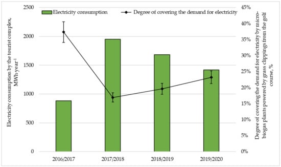 Electricity consumption in a tourist complex varies significantly from year to year, which is dictated by different tourist activity, changing weather conditions during the season, as well as the development of technology and the implementation of new devices in the resort. Figure 3 shows the electricity consumption of the complex from the 2016/2017 season to the 2019/2020 season. The lowest electricity consumption was observed in the 2016/2017 season, when consumption was 885 MWh∙year−1. In such a case, the production of electricity by micro scale biogas plants powered by grass clippings from the golf course would be able to cover the electricity demand to 37.35% (±3.24%). The highest electricity consumption was observed in the 2017/2018 season, when 1950 MWh was consumed, which would be equivalent to covering the consumption to 16.95% (±1.47%) if some electricity was produced from biogas during anaerobic digestion of grass clippings. In the remaining 2018/2019 and 2019/2020 seasons, electricity consumption in the tourist complex was 1684.3 MWh and 1421.7 MWh, respectively. Electricity from a micro scale biogas plant would be able to cover this consumption to 19.63% (±1.70%) and 23.25% (±2.02%). Taking into account the average value of electricity consumption from 4 seasons, amounting to 1485.3 MWh, which would be associated with the average possibility of covering the consumption with energy from biogas to 22.26% (±1.93%).
