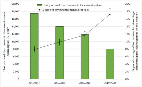 In the current system the farmhouses and the club-house have air–water and/or air–air heat pumps. The tourist resort also has its own thermal plant powered by various types of biomass for heating the buildings of the village. The heat produced from biomass differs significantly between seasons (Figure 4). The highest demand for heat was observed in the 2016/2017 tourist season, when the heating plant produced 17463.6 GJ of heat. In the following years, the amount of heat produced decreased and amounted to 14040.0 GJ, 11857.68 GJ, and 8053.24 GJ in the 2017/2018, 2018/2019 and 2019/2020 seasons, respectively. Therefore, it should be noted that the construction of a micro biogas plant powered by grass clippings from a golf course is able to significantly reduce the consumption of biomass in the thermal biomass plant. For the most demanding heating season among the last 4 seasons (2016/2017), a micro scale biogas plant would be able to cover the heat demand for heating buildings of the village to 7.95% (±0.69%). For subsequent seasons, as the demand for heat decreases, this indicator would increase and amount to 9.89% (±0.86%) for the 2017/2018 season, 11.71% (±1.01%) for the 2018/2019 season, and 17.24% (±1.49%) for the 2019/2020 season, respectively.