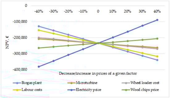 Figure 5 shows NPV value as a function of price decrease/increase for a given factor. The cost change of 6 factors was assessed: biogas plant, operational labor, microturbine, electricity price, wheel loader, and wood chips price. The possibility of a decrease or increase in the prices of a given factor by a maximum of 40% was taken into account.