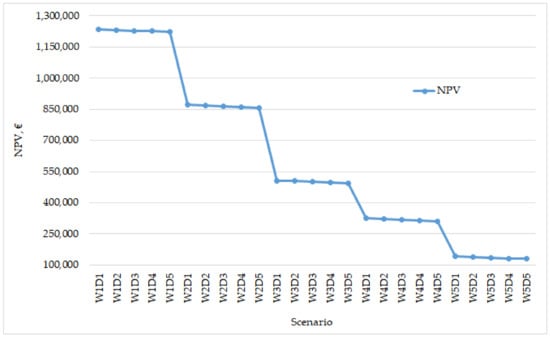 The NPV indicator is the main method of evaluating investment projects in terms of time. This ratio discounts future cash flows resulting from the functioning investment with an assumed discount rate and then summing them together [61]. The indicator is calculated from the following formula: