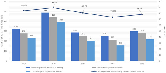 The concentration of coal mining production worldwide and the winning of thinner and thinner coal seams means that the mining personnel are exposed to a number of hazards. Coal dust is one of such hazards. It is first and foremost a danger of explosion, endangering human life, and damaging equipment; however, coal dust is also a lung hazard arising from its prolonged exposure to the human respiratory system. Despite international efforts to predict and protect miners’ health, a constant high incidence of lung diseases among miners, often with severe consequences, has been recorded for several years [1,2,3]. Pneumoconiosis resulting from long-term inhalation of free silica, manifested by chronic bronchitis and emphysema, and sometimes by heart failure and cardiac hypertrophy, is the most common occupational disease caused by mine dust [4,5]. Symptoms of pneumoconiosis usually appear after several years; therefore, these diseases are most often diagnosed only among retired miners [6]. The share of new cases of pneumoconiosis diagnosed in Poland, and caused by coal mining processes, is shown in Figure 1 [7,8].