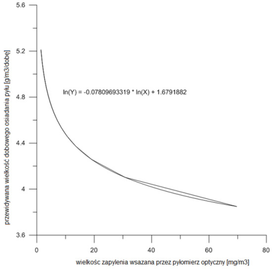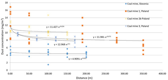 Based on the results of dust concentration measurements in three gates, an equivalent equation for PM10 dust concentration (measured by Pł-2 dust meters) depending on the distance from the dust source, was obtained in the form of y = 97.201 × x−0.42 (Figure 15).