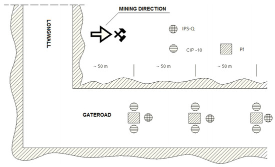 Dust concentration measurements required for the prediction analysis were taken using three types of devices: CIP-10-R gravimetric dust meters, IPSQ particle analyzer, and the Pł-2 optical dust meter. Measurements were taken in the hard coal mines of Jastrzębska Spółka Węglowa S.A., Polska Grupa Górnicza S.A. and Premogovnik Velenje mine in Slovenia during normal mine operation. Dust concentration measurements were taken in longwall panels and roadways. The measuring points were set at a distance of about 50 m from each other, at least at three points. The first measuring point was placed just behind the dust source, i.e., behind a roadheader in a coal face or at the air outlet from a longwall face. Subsequent stationary measuring points were placed in the axis of the working, at the height of 1.5 m, at distances of 50 m, 100 m, 150 m, 200 m, etc., in accordance with the following scheme of measuring devices arrangement (Figure 3).