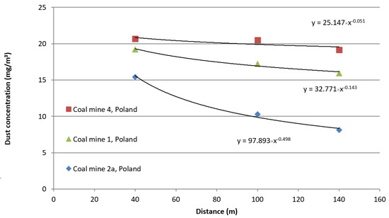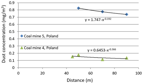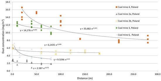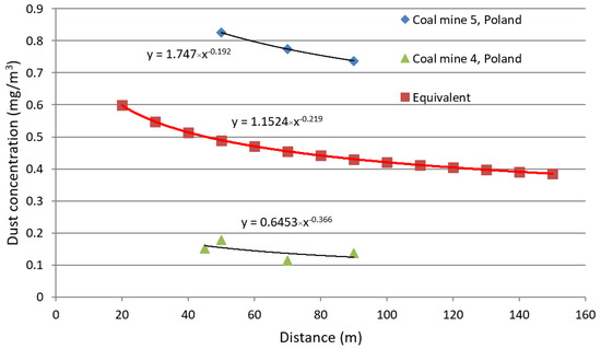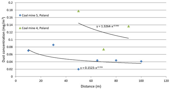 Based on the measurements of dust concentration in five coal faces, the equivalent equation for PM4 dust concentration (measured by CIP-10R), depending on the distance from the dust source, was y = 13.037 × x−0.159 (Figure 19).