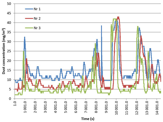 The results of measurements taken by the Pł-2/100 optical dust meter consist of the recorded momentary time processes of PM10 dust concentration in coal faces and gates. Sample waveforms of the momentary concentration of PM10 dust in one of the mines, obtained from three Pł-2 dust meters located in the coal face, are shown in Figure 12.