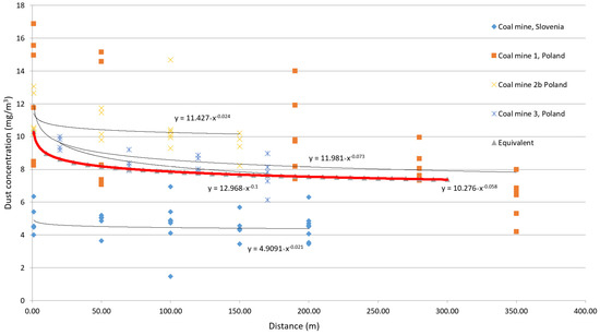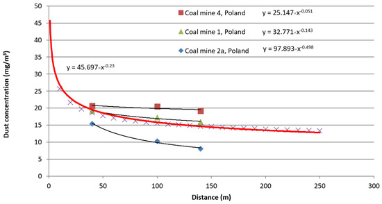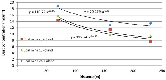 Based on the same method, characteristics and equivalent equations were determined for the coalface. Based on the measurements of dust concentration in three coal faces, the equivalent equation for PM10 dust concentration (measured by CIP-10R), depending on the distance from the dust source, was y = 45.697 × x−0.23 (Figure 18).