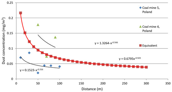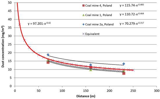On the basis of each dust concentration extrapolated to a distance of 300 m, the average value was determined, which was the base for the development of universal equivalent characteristics, and then the equivalent equation was determined for a given dust fraction and a given type of mine working (for a coal face and a gate).