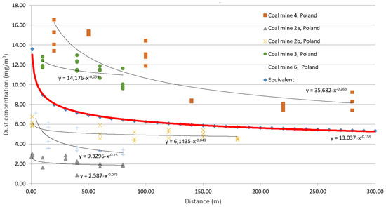Equivalent characteristic of PM4 dust concentration (measured by CIP-10R dust meters) depending on the distance from a dust source, based on dust concentration measured in five coal faces.