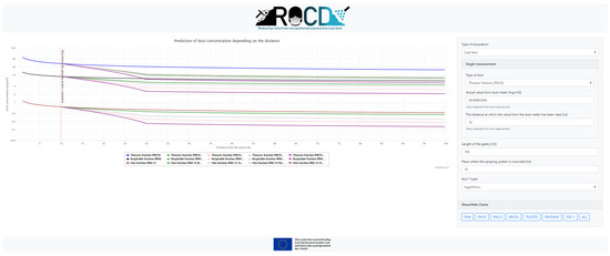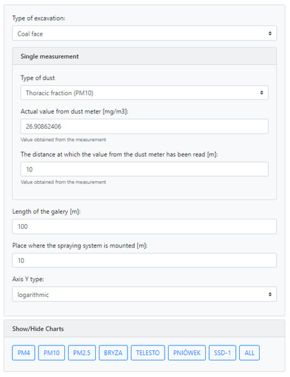 Prediction of concentration of each type of dust: PM10, PM4, and PM2.5 (even if dust concentration from only one point is known), on the basis of the developed mathematical, empirical models, was possible, at any distance from the dust source. Dust concentration in the gates and coal faces tested within the project can be predicted on the basis of the obtained results (Figure 21). Data on the effectiveness in reducing the concentration of each type of dust by the most frequently used spraying devices in the Polish mines were additionally implemented to the application. This allows for the assessment of their impact on dust concentration (different fractions) in the selected places of mine workings, and therefore to select the most preferable device with respect to the reduction in a given type of dust. The application for predicting the dust concentration is divided into a part showing the results of dust concentration depending on the distance from a dust source in the form of graphs (left side of the window) and in the form of a panel for entering input data for the simulation (right side of the window).