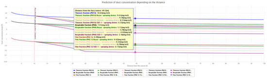 After entering the data into the application panel and turning on each characteristic to be displayed, the predicted dust concentration [mg/m3] depending on the distance [m] are displayed in the graphic window (Figure 23). The graphic window displays the characteristics of the distribution of the PM10, PM4, and PM2.5 dust concentrations depending on the distance from a dust source. When determining the impact of the spraying device used (BRYZA, TELESTO, PNIÓWEK, SSD-1), additional characteristics are displayed showing their impact on a given type of dust. After moving the cursor over any of the characteristics, a window appears with the forecasted results of concentration for each type of dust, with and without spraying devices.