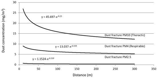 Characteristics and equations of PM10, PM4, and PM2.5 dust concentration for a gate, depending on the distance from the dust source, developed on the basis of in situ tests.