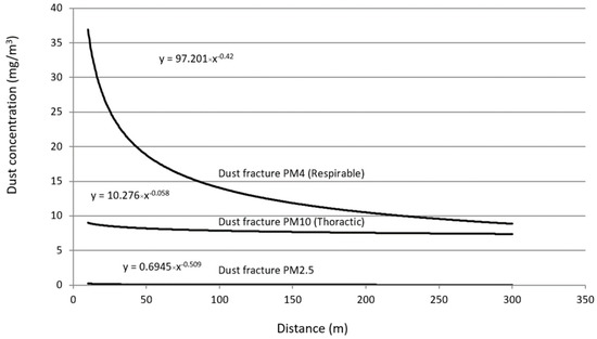 On the other hand, on the basis of dust concentration measurements in four gates, the equivalent equation for PM4 dust concentration (measured by CIP-10R), depending on the distance from the dust source, was y = 10.276 × x−0.058 (Figure 16).