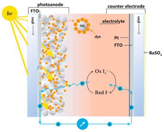 The photoelectrodes used in the investigated DSSCs, prepared by deposition of the TiO2 paste, exhibited porous structures suitable for adsorption of the dye. The observed light-scattering ability of the TiO2 layer can enable better capturing of the light. The diffuse reflectance of the prepared TiO2 layer is relatively high in comparison to a lower value of 25% or narrow reflectance range in the literature [40,41].