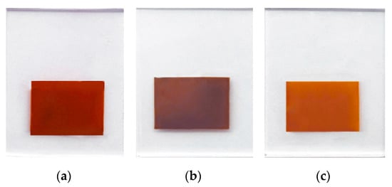 Photos of TiO2 photoelectrodes after the immersion in the solution of (a) 2 mM PF in ethanol, 2 h soaking time; (b) 2 mM PCV in ethanol, 1 h soaking time; and (c) 2 mM AL in ethanol, 2 h soaking time.