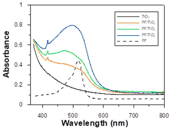 The sensitizing compound used in a DSSC should absorb light, preferably in a broad range of the visible spectrum. In order to verify the coverage of the light spectrum by the investigated dyes, especially after the process of adsorption on TiO2 nanoparticles, the absorption measurements were performed. The absorption spectra in Figure 6 show that free PF dye solution in ethanol exhibits only a narrow absorption band around 520 nm; however, upon adsorption on TiO2 nanostructural coverage of electrodes, a significant broadening of the absorption range occurs. In consequence, the absorption covers a variety of wavelengths from around 400 to 600 nm. Below 400 nm, the absorption of bare TiO2 is observed.