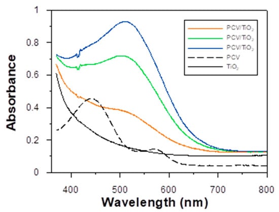 The absorption spectrum of PCV in free form in an ethanol solution consists of two bands: one with a maximum around 450 nm and the second, much weaker, band at 575 nm (Figure 7). The adsorption of PCV on TiO2 leads to the broadening of the absorption range that covers the visible spectrum nearly to 700 nm.