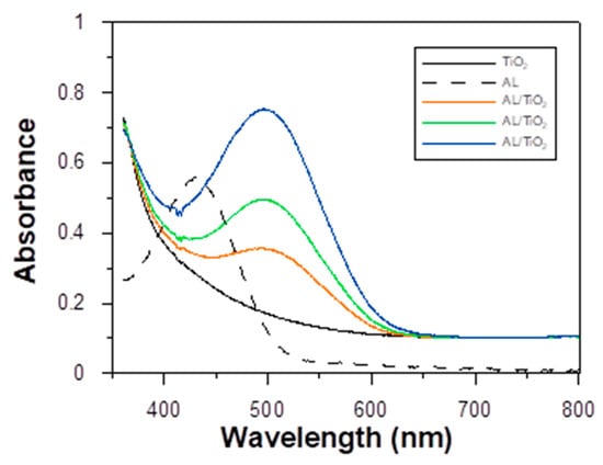 Absorbance spectra of the AL solution, AL adsorbed on AL/TiO2 complex and bare TiO2 photoelectrode.