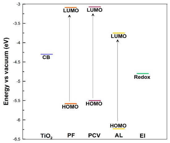 Scheme of the energy levels of PF/TiO2, PCV/TiO2, AL/TiO2, TiO2 and I−/I3− electrolyte redox potential.