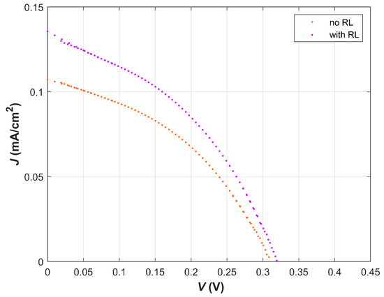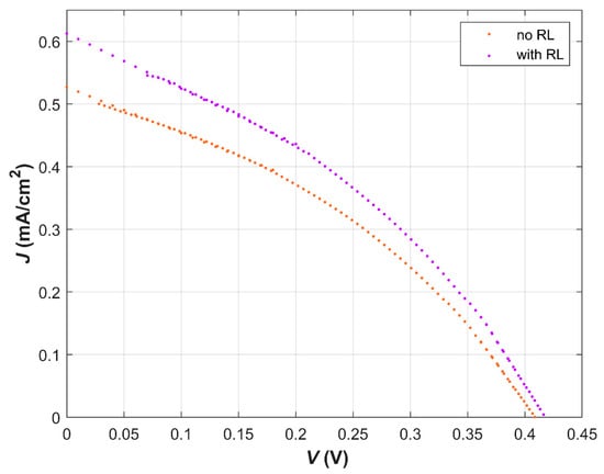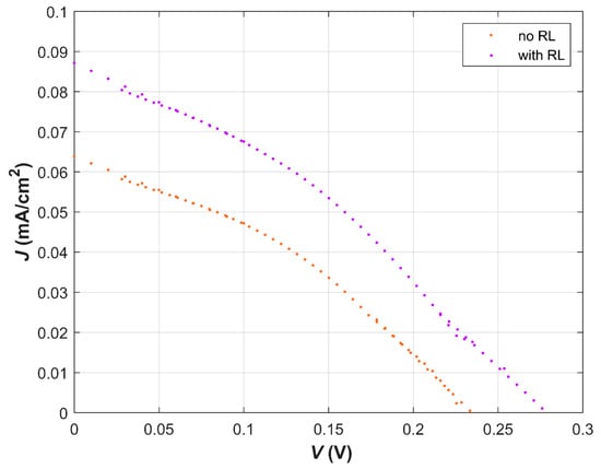The J–V characteristics of the AL-sensitized dye cells (2 h immersion time), measured without the reflective layer (no RL) and with the reflective layer (with RL).