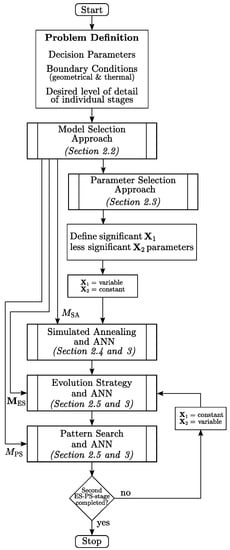 In this paper, with the SA, the ES and the PS, three different optimization methods are combined in one optimization environment, thus exploiting synergies. While the stochastic SA method exhibits good global convergence with low local convergence speed, the ES method is known for stable convergence in the local group [25]. PS, as a deterministic method, provides a tool for fast local convergence [26]. In the following, the multi-stage optimization environment used in this work is presented. First, the overall structure of the optimization environment is explained and then the individual parts of it are described in more detail.