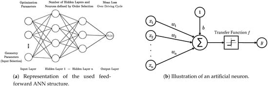ANN consist of several artificial McCulloch–Pitts neurons. The structure of such a neuron is shown in Figure 2b. The input values of the neuron are thereby multiplied by weighting factors . The result of the summation of the weighted input values is adjusted with an offset b (also: bias) and projected to the output y via a transfer function f [33]. This results according to