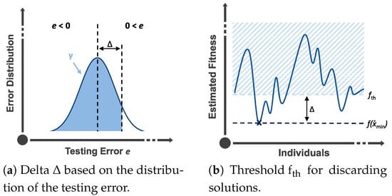 The output or solution of the network are the mean loss over the driving cycle of the considered individual. To ensure that the preselection of individuals by the ANN does not discard solutions that would otherwise represent a new optimum, a threshold is introduced. Here, individuals whose estimated fitness is above the threshold are discarded and otherwise simulated. To determine the threshold, a delta is introduced. This results from the given estimation reliability of the ANN as well as the error distribution of the testing error to