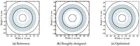 Starting from the cross-section of the rough designed machine shown in Figure 4b, the geometry optimization of the IM is performed. The cross section of the resulting machine geometry of the optimization is shown in Figure 4c. The basic design is similar to that of the reference machine. The optimized geometry differs primarily by two additional rotor bars, a rotor diameter larger by approximately and a shortened active length of .