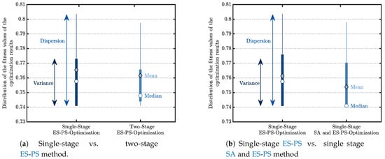 The stochastic method used in the hybrid optimization is the ES according to [24]. The method is based on populations of individuals in the solution space, in which a generation with () parents creates () children via crossover and mutation. A distinction is made between the plus strategies ( + ), in which a new generation can be composed of parents and children, and the comma strategies (, ), which only consider the best descendants for the next generation of parents [24]. The method used in this work is based on the comma strategy, as this introduces a maximum “lifetime” of the individuals and thus counteracts premature local convergence. The method is structured in an initialization, a selection, a mutation, a crossover and an inheritance process. The method, especially in the case of mutation and crossover, is problem-specific. Gaussian distributions can be used as a statistical basis. Their variance is flexibly adapted as a function of various parameters in order to achieve good local convergence while at the same time enabling a global search. This achieves the already mentioned stable convergence in the local group. Due to the generation principle, there is the inherent possibility of parallelization, which results in a reduced computing time compared to other stochastic optimization methods [32].