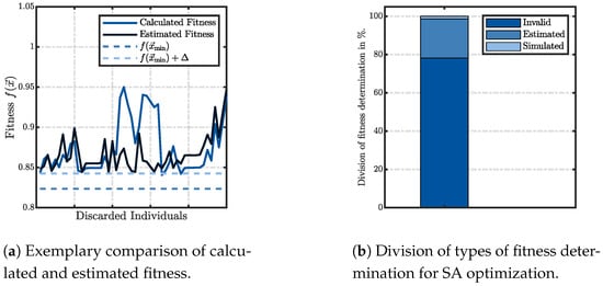 The basic principle of the methaheuristic optimization method of SA according to [23] describes the quality of a possible solution or an individual x by means of a fitness function f. The goal of the optimization is to minimize the fitness . Starting from an initial solution , a random selection of new individuals within the solution space is performed. A new individuum is accepted and not discarded if one of the constraints