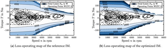 For further verification of the optimized machine geometry, it is modeled by means of T-FEM simulations and compared with the reference machine. The operating maps of the total losses of the reference machine and the optimized machine resulting from the T-FEM are shown in Figure 7a,b. Here, the optimized geometry exhibits higher total losses, especially at the borders of the operating map, but the losses in the WLTC 3 driving cycle are of a similar order of magnitude to those of the reference machine.