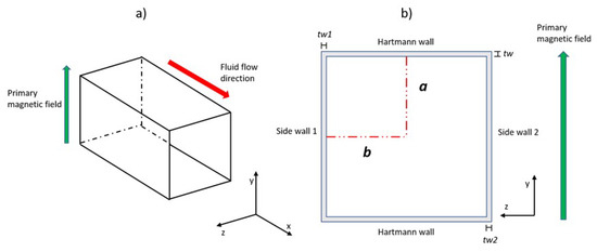 (a) Three-dimensional view of a generic hydraulic element (single volume). The green vector is the magnetic field applied and is considered perpendicular with respect to the fluid stream direction (red arrow). (b) Cross-sectional view of a hydraulic element. Walls perpendicular to the magnetic field are called Hartmann walls, while those aligned to the magnetic field are referred as Side walls. Characteristic lengths of the component a and b are underlined, and thickness of the walls () as well.