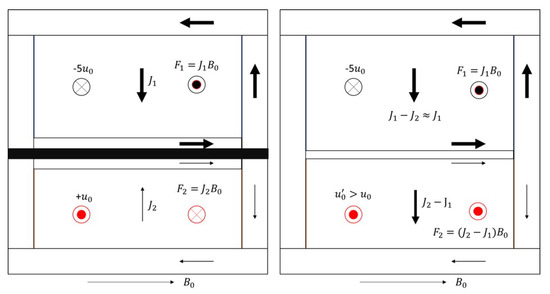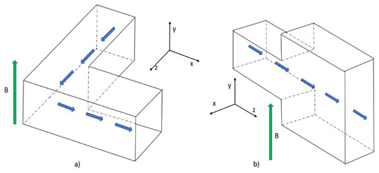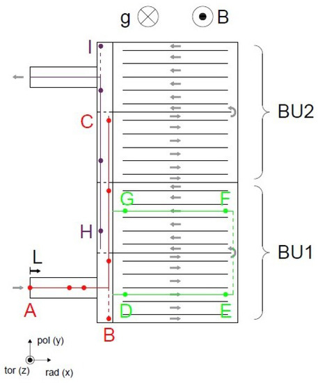 In Equation (1), the first right-hand term () quantifies the pressure losses due to Lorentz forces opposite to flow direction, induced by electrical currents that are confined in a plane perpendicular to fluid velocity. Two-dimensional MHD pressure drop is the only term driving the head loss in a fully developed flow configuration, i.e., in straight conduits. The second right-hand term () stands for the contribution of not “cross-sectional” currents (three-dimensional currents) that, interacting with the magnetic field, produce Lorentz forces in other direction than the stream one. Three-dimensional currents arise whenever axial electric potentials are induced within the fluid body either due to the channel complex geometry (cross-section variation, change of stream direction, etc.), or non-uniform electromagnetic boundary conditions, may that be a discontinuity of wall conductivity or a strong magnetic field gradient [6]. Formally, the total head loss () in a closed system is composed by the sum of the hydrodynamic pressure drop, caused by distributed and concentrated friction losses, and the overall MHD loss due to the electromagnetic drag: