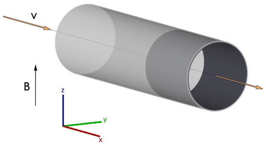 In Equation (3), vectors v, j and B stand for velocity, current density and magnetic field, respectively, and p is the pressure. They are made nondimensional by scaling with the mean velocity , and the external magnetic field magnitude ; the nondimensional pressure p is scaled through the value .