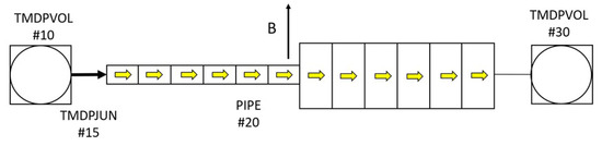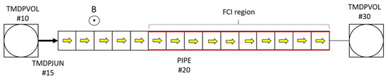 In Equation (20), the internal radius of the bare duct is chosen as characteristic length. Factor stands for the nondimensional fully developed flow pressure gradient, defined by Miyazaki et al. in [23]. Moreover, it is worth underlining that Equation (20) seems to be valid in the whole range of the experiment, namely for each Hartmann number and Reynolds number investigated [43]. In Figure 5, the meshing scheme employed for calculations is shown. Inlet conditions of the liquid metal are imposed by a time-dependent volume (TMDPVOL ) and a time-dependent junction (TMDPJUN ). The TMDPVOL sets NaK inlet temperature and the TMDPJUN imposes the liquid metal mass flow rate. The liquid outlet pressure is fixed by an additional time-dependent volume (TMDPVOL ). A pipe component (PIPE ) is used to model the conduit, that is divided in 15 single volumes, thus, linked by 14 single junctions. In the last 10 volumes, the isolation layer is applied; this is accomplished by modelling thinner stainless-steel walls, in order to obtain the same conductance ratio that is reported by Bühler, [43]. In Table 4, the main parameters are reported.