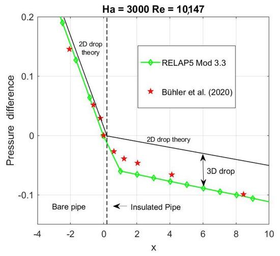 The V&V procedure of the RELAP5 MHD module involves the comparison of the results deduced by the code with those of direct numerical simulation tools and data obtained by experimental works. Notable examples of V&V for MHD numerical solvers are found in References [46,47,48,49,50]. At first, simple test cases are employed to verify the response of the program in terms of magnetohydrodynamic pressure drops, either for 2D and 3D phenomena, thus testing the reproduction of a single MHD phenomenon separately. In itself, this is not considered satisfactory to assess the reliability of the code, thus more complex systems are analysed, i.e., two Test Blanket Modules (TBMs) concepts, to demonstrate the capability of the various subroutines of the MHD module to operate together and produce physical results. For this purpose, the numerical analysis performed by Swain et al. in [51] on the Lithium Lead Ceramic Breeder (LLCB) TBM at fusion-relevant magnetic field intensity is repeated with RELAP5 and an excellent quantitative agreement is found on the total pressure drop and local pressure profile.After that, the experimental data produced by the campaign carried out by KIT researchers on a Helium Cooled Lithium Lead (HCLL) TBM mock-up have been considered to further demonstrate the performance of the code against a more realistic benchmark [33]. The module geometry is simulated with the code and, again, an excellent agreement is found in terms of pressure drop prediction. It should be stressed that the HCLL TBM mock-up can be considered by all means a state-of-the-art scaled-down integrated effect test (IET) facility since it represented all relevant isothermal MHD phenomena but for a skewed (toroidal-poloidal) magnetic field that, however, is unlikely to be achieved before the start of the experimental TBM phase in ITER.