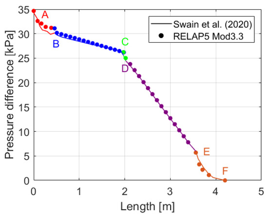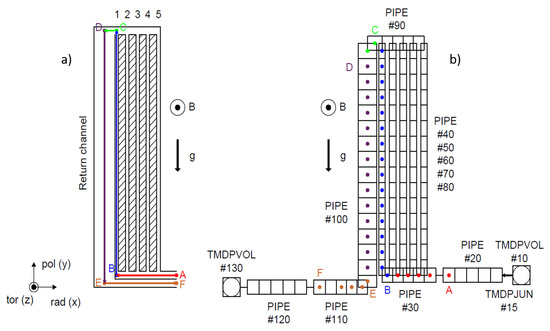 Magnetohydrodynamic pressure drops in liquid metal circuits depend on all parameters discussed above. As already pointed in Section 1, 2D MHD pressure drop can be considered as the analogue of hydrodynamic friction loss (also referred as distributed head loss). It is the “electromagnetic drag” that dissipates fluid kinetic energy via Joule effect. This phenomenon has been studied in-depth hence its characterization can rely on an exhaustive amount of data. Therefore, extensively validated correlations are available in the literature for fully developed magneto-hydraulic loss of load [6,23,24]. Nevertheless, it is crucial to underline that the current version of RELAP5 can model only ducts which are assumed to be immersed in a dielectric medium, i.e., air. This assumption is not usually verified in a reactor where, unless the liquid metal is insulated from the structural material through some technical means, the conduits are in electrical contact with each other. Theoretical understanding of electromagnetic coupling is still limited; it is not possible, at this stage, to develop a suitable system code model to account for its effect (i.e., altered pressure loss and flow distribution). However, the above-mentioned assumption, although portraying a simplified picture, is still useful to predict pressure loss figures that are representative of the behaviour of a more realistic system, as it is demonstrated in Section 4.