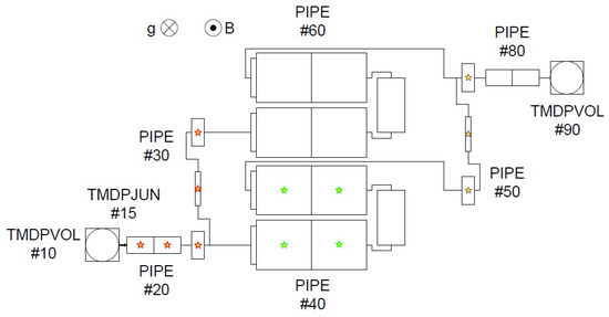 Sketch of the RELAP5 nodalization. Yellow arrows mark the fluid path. Magnetic field (B) is shown with a black vector.