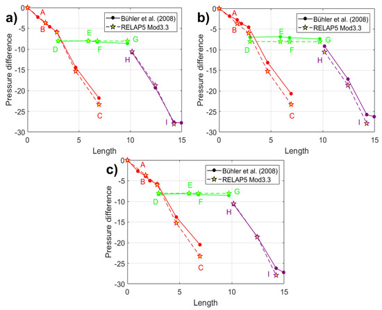 Correlations (15) and (16), originally developed for this latter case, are adapted to perpendicular bends by adopting a scaling factor [5]. Such corrective factor has been arbitrarily chosen to take in account the minor impact that bends have on the overall loss of load if compared with bends. This formulation has been proven reasonably reliable for modelling complex piping systems involving bending conduits, as discussed in the following (i.e., Secetion Section 4). When more data will be available in the literature, which is currently lacking comparative analysis for those configurations, it is planned to reassess the scale in the interest of a better fidelity to physical behaviour. and are shown in Equations (17) and (18), respectively.