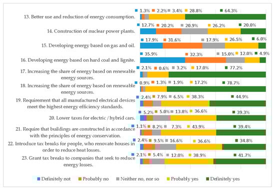 Regarding the directions of state support in the area of energy management, the respondents primarily expected the development of energy using renewable energy sources (95.9%), energy-saving construction (83.4%), and high energy efficiency of manufactured devices (83.2%). The large support for the theses relating to the need to conserve energy and improve energy efficiency proves the high environmental awareness of the respondents (Table 6).