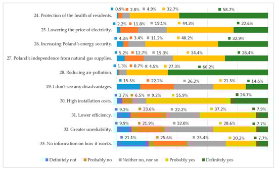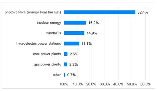 The research shows that among the respondents, support for the development of photovoltaic energy dominates. It is an interesting result as it proves the high ecological awareness of the respondents. The positive effects of the development of photovoltaics relate to distributed generation, which does not require investment in grid infrastructure. It is worth emphasizing that in the research area, the government program for cofinancing photovoltaic installations “My Electricity” enjoyed great popularity (the largest in the Podkarpackie Province) [74]. This is a successful observation because photovoltaics have great development potential, especially in the context of new solar energy conversion technologies. It is worth mentioning that in Poland, the production of highly efficient new generation cells, perovskites, has started, which have a chance to dynamize the production of solar energy [75,76]. Therefore, it can be expected that the society in the area studied is ready to disseminate clean energy technologies. The second most important source of energy mentioned by the respondents was nuclear energy, and the third was wind energy. This means that in the group studied the support for nuclear energy is relatively high [77].