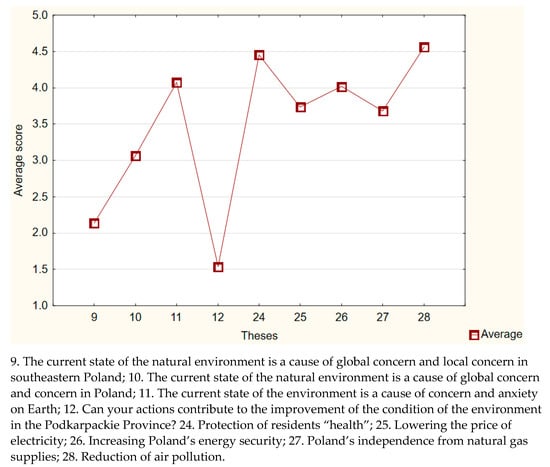In this research, an important issue was the perception of the quality of the natural environment by young people in the context of opinions on the benefits of producing energy from renewable sources. The calculated mean scores for theses relating to these issues are shown in Figure 4.